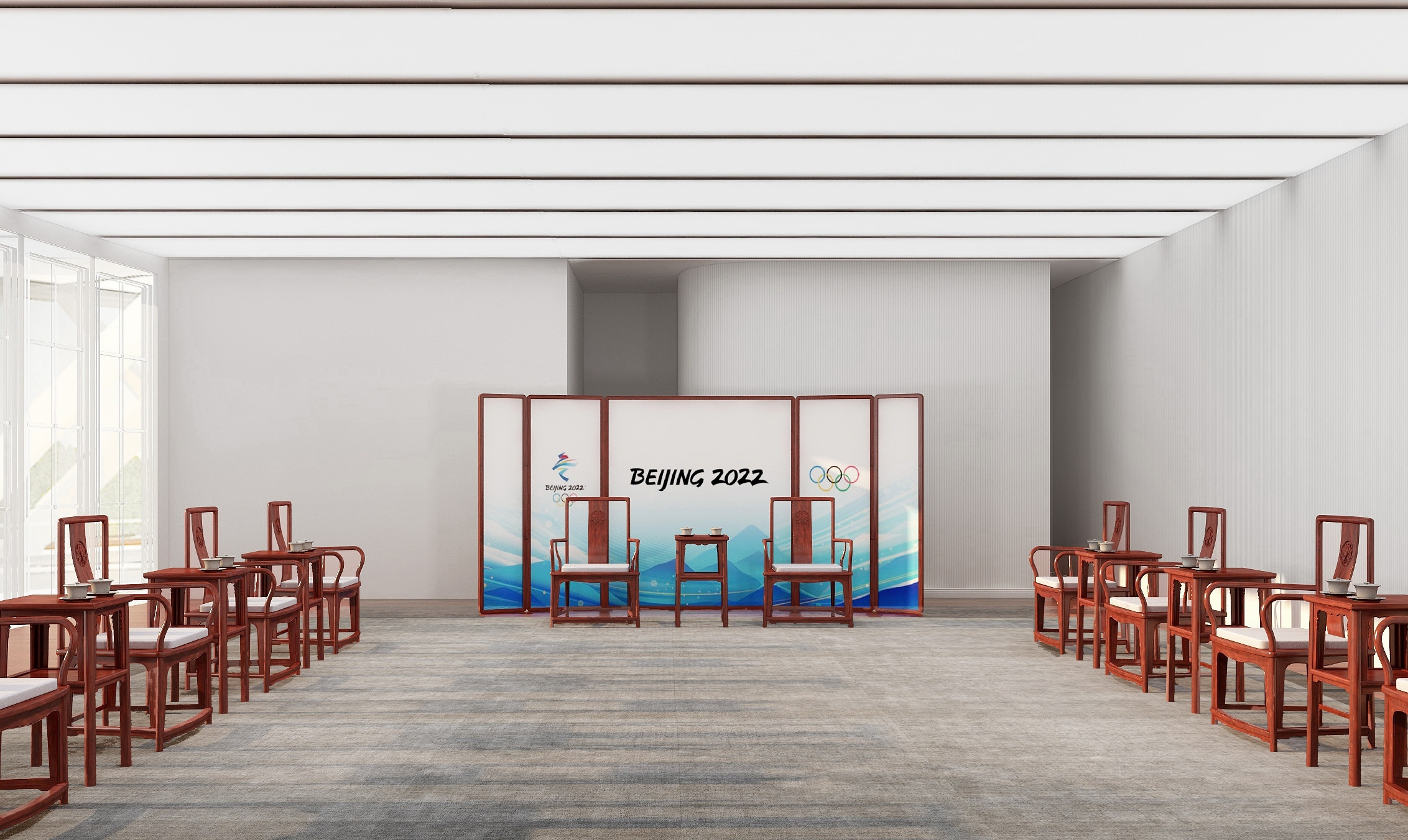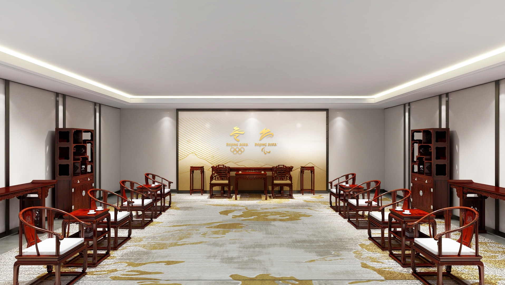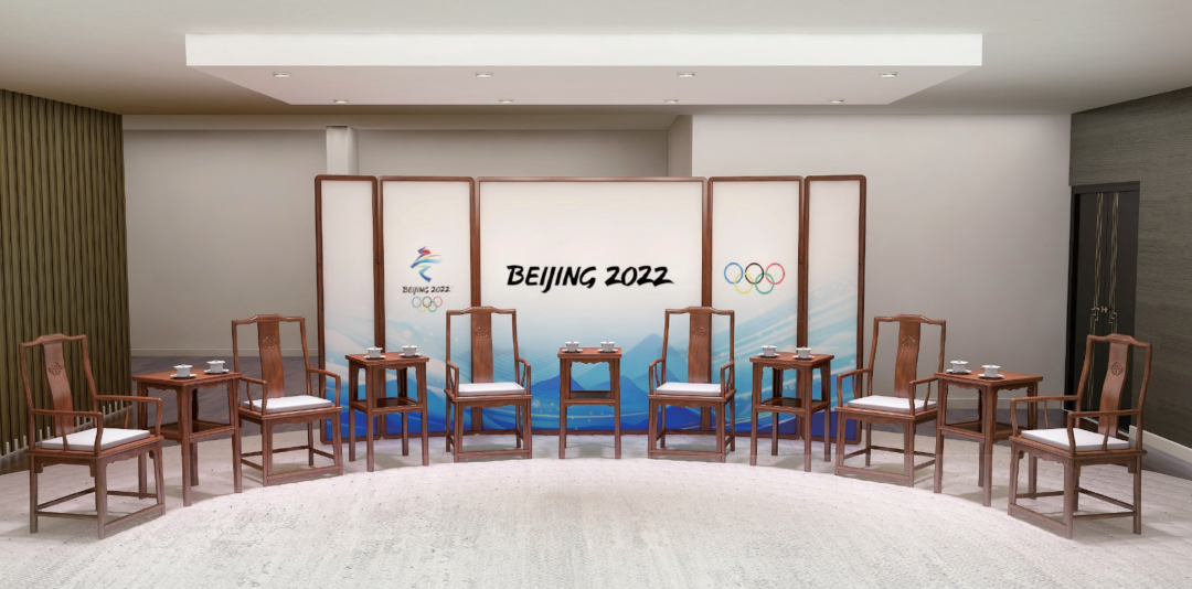2月8日,國(guó)際奧委會(huì)主席托馬斯-巴赫曾在這里觀看冰壺混雙銅牌賽,并在要客區(qū)進(jìn)行休息。要客區(qū)家具布置遵循中式傳統(tǒng)格局,中軸對(duì)稱,周正莊嚴(yán)。核心家具為整套托泥圈椅、托泥圈椅茶幾,古樸典雅。