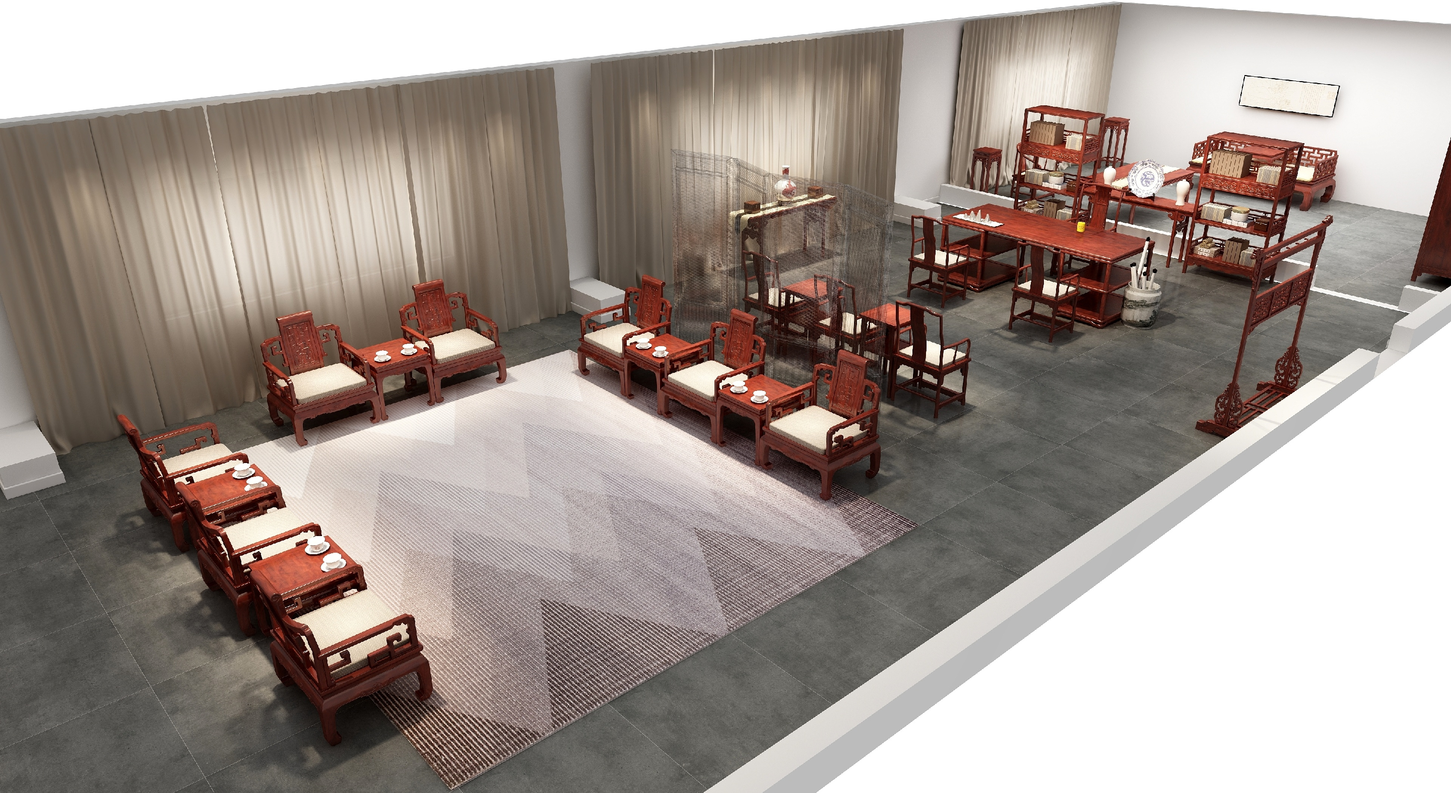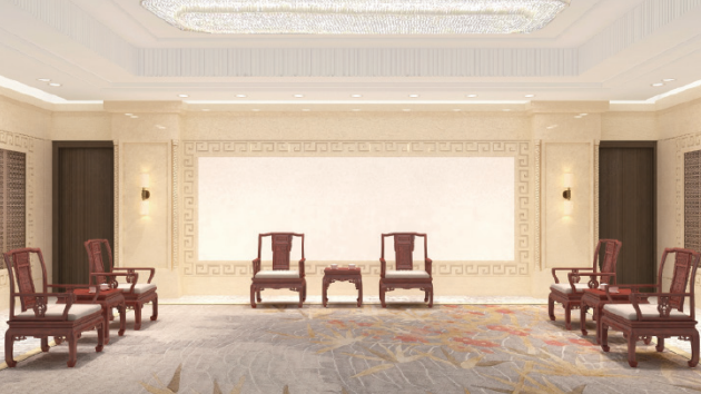 要客區(qū)家具整體以典型明式沙發(fā)(寶座)為主,六件套擺放高雅尊貴,再配以厚重中有妍美之致的拐紋鼓腿方茶幾,烘托出一種蒸蒸日上、繁榮昌盛的狀態(tài),營(yíng)造出具有中式文化底蘊(yùn)的會(huì)客空間。