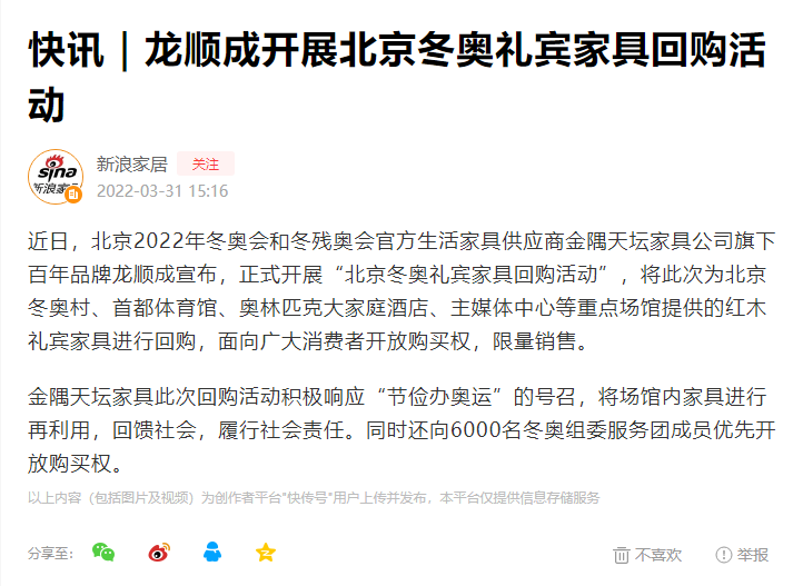 近來,冬奧會在閉幕式之后熱度不減。而關(guān)于冬奧收藏品價值的話題一直在被大家反復討論著,龍順成出品的冬奧場館禮賓家具也作為本次冬奧賽事中的一抹亮色,引來人們紛紛討論。更有網(wǎng)友表示:不管是收藏價值還是藝術(shù)價值,龍順成的這批家具都是最值得入手的。