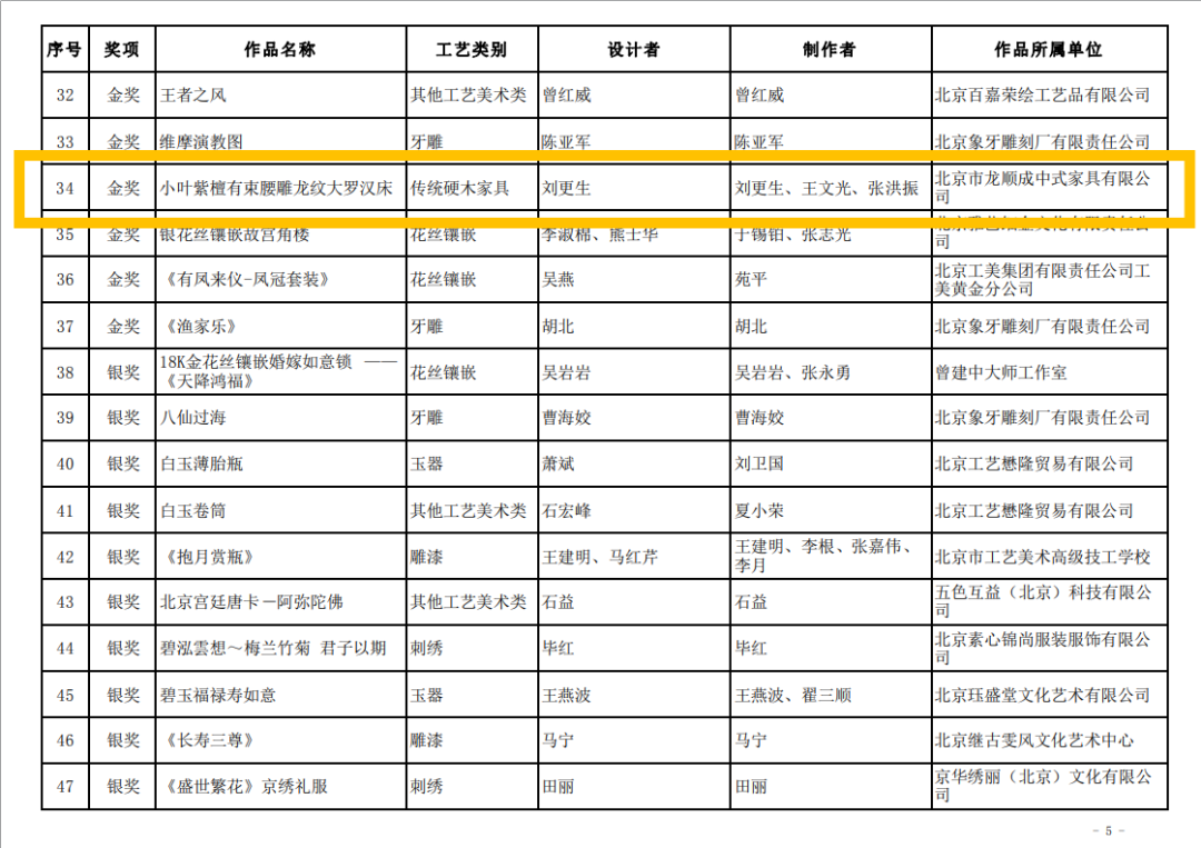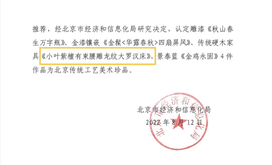 圖片由北京市經(jīng)濟(jì)和信息化局指導(dǎo),北京市經(jīng)濟(jì)和信息化局產(chǎn)業(yè)發(fā)展促進(jìn)中心、北京工藝美術(shù)行業(yè)協(xié)會(huì)、北京工藝美術(shù)學(xué)會(huì)主辦的2022年“工美杯”北京傳統(tǒng)工藝美術(shù)大賽已于日前結(jié)束,“大國(guó)工匠”劉更生作品小葉紫檀有束腰雕龍紋大羅漢床榮獲工美杯金獎(jiǎng)。這是本次“工美杯”傳統(tǒng)硬木家具類別唯一的金獎(jiǎng),也是僅有的四件獲評(píng)“北京傳統(tǒng)工藝美術(shù)珍品”榮譽(yù)的作品之一,這也是近年來(lái)硬木家具行業(yè)在工美杯評(píng)選中獲得的最好成績(jī)。