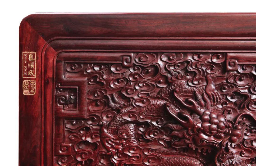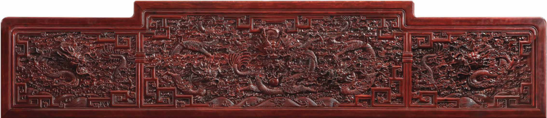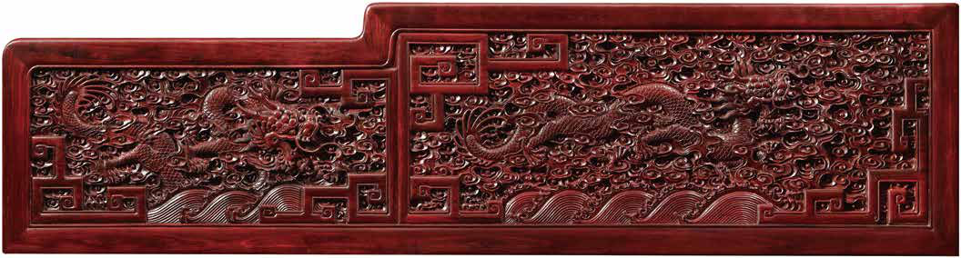 靠背中間雕有正臉的五爪麟龍,兩側(cè)雕四條行龍,側(cè)圍板里外各雕兩條行龍。中間布海水云紋,五爪麟龍形態(tài)各異,穿行于云海之間。