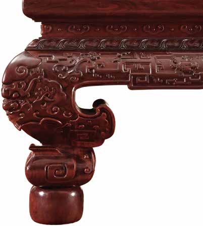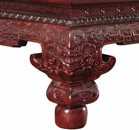 座面下采用鼓腿彭牙式,牙板挖樘肚,雕獸面、夔龍和拐子龍紋。床腿大挖馬蹄,兜轉(zhuǎn)有力,腿子粗壯,雕獸面火焰紋,下承腿足。