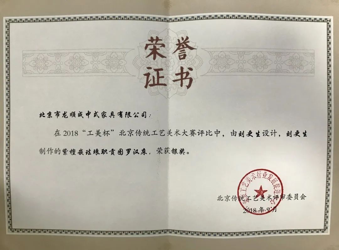 2020年仿臺(tái)北故宮羅漢床獲得“北京工美杯”銀獎(jiǎng)